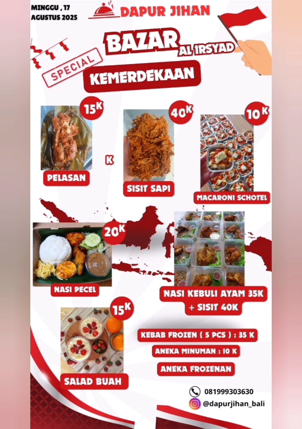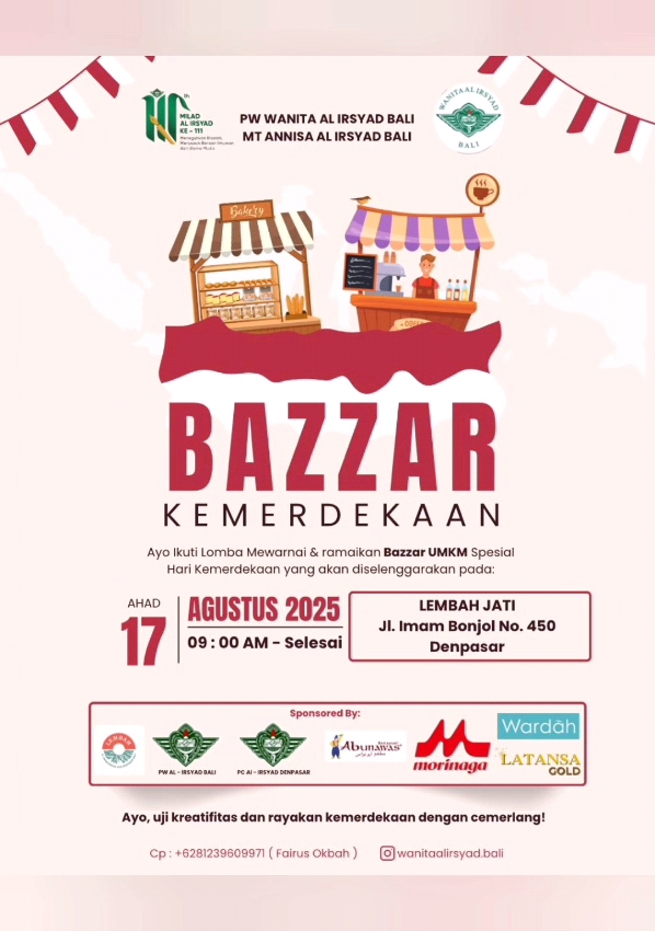 PWW Bali mengucapkan Selamat dan menggelar Bazar UMKM untuk menyemarakkan hari kemerdekaan Indonesia yang ke-80 sekaligus Milad Al-Irsyad Al-Islamiyyah ke-111. Semoga acara ini membawa berkah untuk semua peserta dan pengunjung Bazaar.